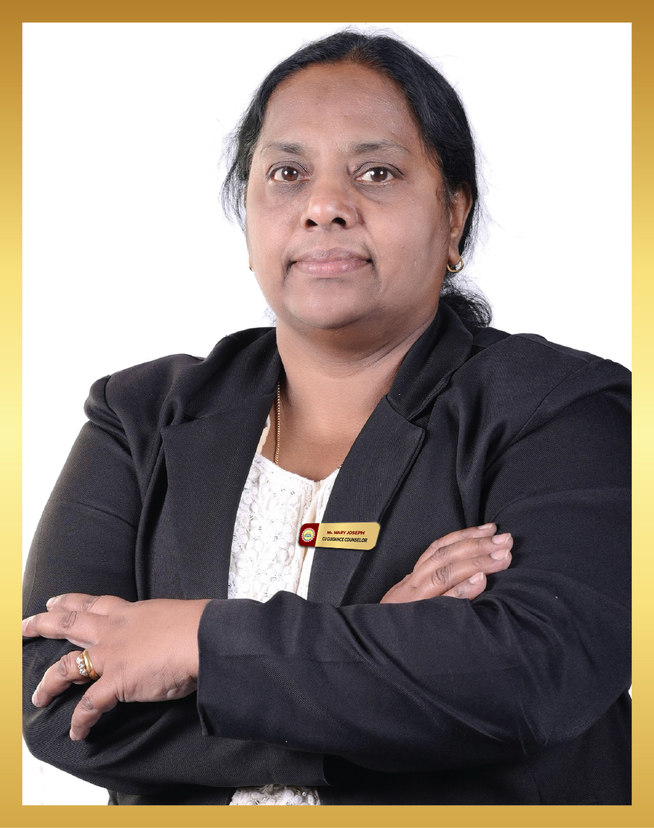 With over 33 years of dedicated service in education and counseling, Ms Mary Joseph brings a unique blend of compassion, experience, and expertise to every role she undertakes. She holds an M.Phil. in Counseling, a Master’s in Psychology, a B.Ed., a Diploma in Proficiency in Counseling, and certifications including Global Career Counselor (Univariety & University of California, Los Angeles) and NCDA Certification (American Counseling Association).
